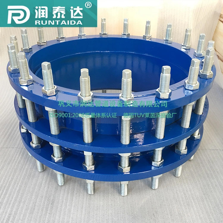 雙法蘭傳力接頭是由兩片法蘭、壓蓋、套筒等組合而成的,與管道連接采用雙法蘭的連接方式,因此管道配對法蘭的選取尤為重要,傳力接頭出廠一般噴涂孔雀藍(lán)色聚酯防腐漆起到防腐防氧化作用,因此其兩片法蘭上也噴涂有防腐漆,這個漆的噴涂要均勻,水線臺不可有斷縫,同時法蘭的相關(guān)數(shù)據(jù)要和配對法蘭一致,例如:法蘭中心距、法蘭外徑、法蘭孔數(shù)以及法蘭孔徑等要一致。這樣才能保證產(chǎn)品與管道配對法蘭連接時能夠完好的連接,同時如果有需要可以在產(chǎn)品與配對法蘭連接時安裝橡膠密封墊起到更加緊密的作用,如果不安裝密封圈,要保證兩片法蘭的連接螺栓受力均勻,不可壓偏。